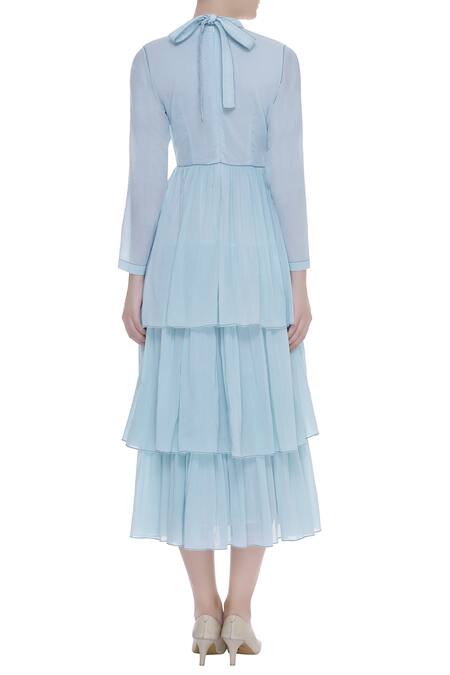 Put forth an ultra-chic look at your upcoming garden party in this blue, layered dress. Features a high-collar, tie-up neckline, this elegant addition is enhanced with pleated details.
