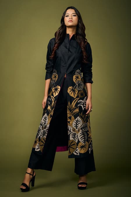 Black silk jacket with leaf applique embroidery.