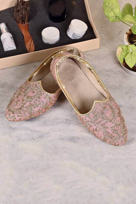 Baby pink juttis with leaf embroidery & pointed toe detailing.