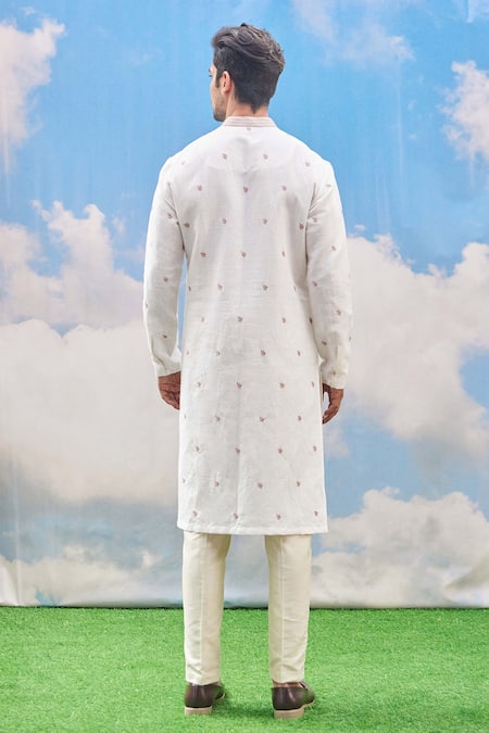 Off white kurta with hand embroidered leaf motifs. Paired with tie-dye coral pink, white stole & beige silk pant.
