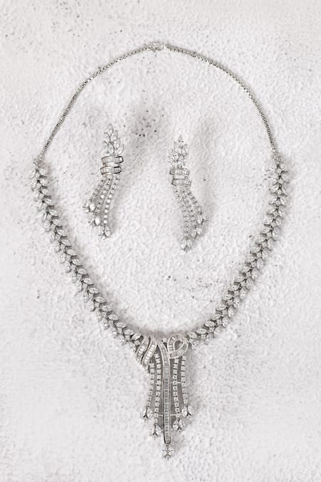 Rhodium plated necklace with leaf motifs, encrusted with American diamonds stones. Paired with drop earrings.