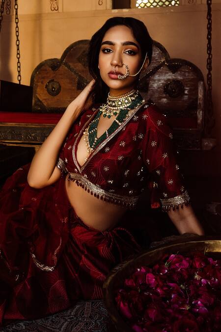 Ruby lehenga featuring all-over printed leaf motifs. Paired with embroidered V-neck blouse with beaded tassels and an embroidered tulle net dupatta.