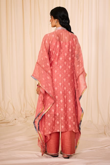 Pink kaftan featuring batwing sleeves, mandarin collar, and 3D floral embellishments. Paired with a soft mulmul cotton inner and side slit pant.