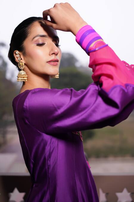Purple Chanderi, Cotton Sequins, Bird Applique Embroidered Anarkali Palazzo Set