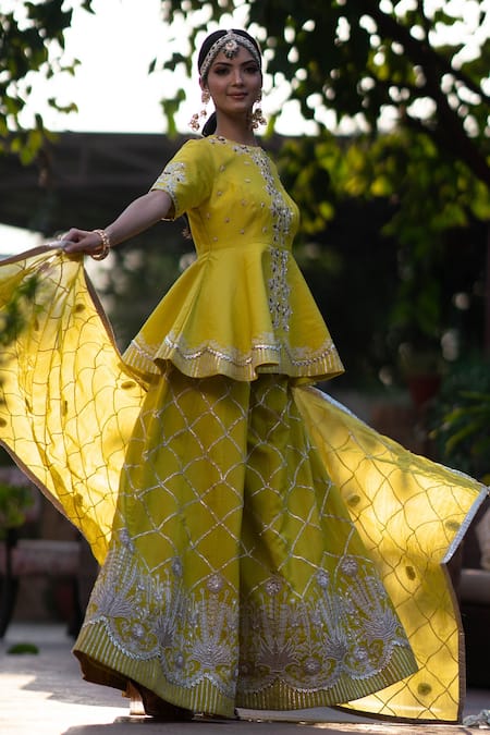 Lime green peplum style kurta with floral, zari, sequin embroidery. Paired with gharara & dupatta.