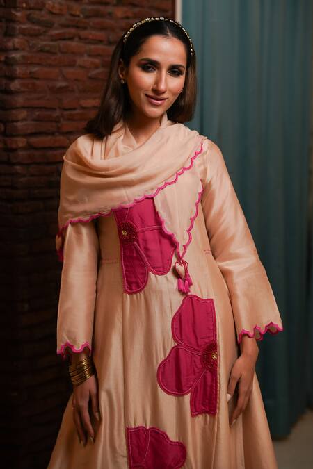 Beige Anarkali featuring hot pink flower applique patchwork and bead embroidery. Paired with a scallop bordered palazzo and scarf.