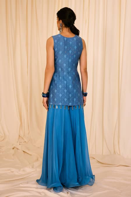 Blue kurta featuring lotus woven patterns with zari embroidery and embellished with lace and kasab. Accompanied by matching palazzo and dupatta.