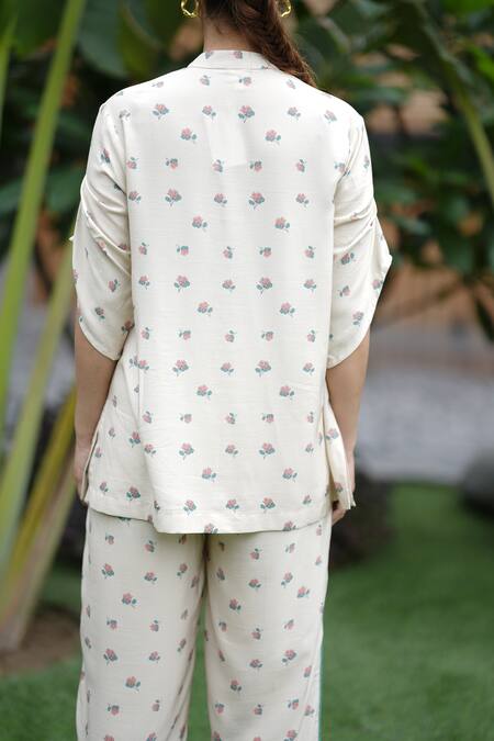 Buy_Leela By A_Beige Tencel Embroidery Mandarin Collar Lotus Print Shirt With Pant _Online_at_Aza_Fashions