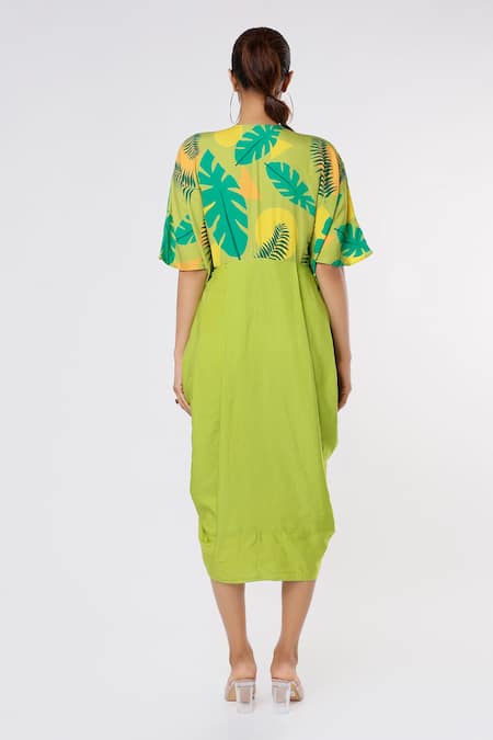 Green Tencel Modal Twill Tropical Print V Neck Yoke Cowl Draped Dress