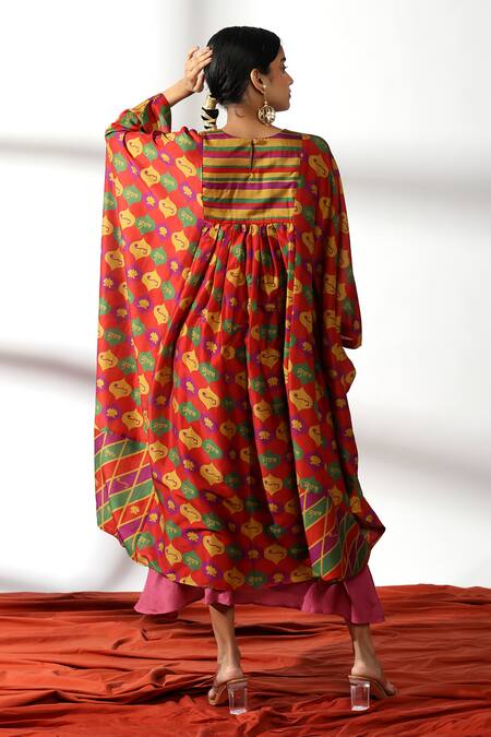 Red kaftan featuring batwing sleeves, round neckline, and sequin embellished yoke with temple arch and striped prints. Comes with an inner component for added comfort.