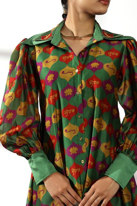 Green Chanderi Embroidery Collared Temple Arch Print Shirt Kurta With Pant
