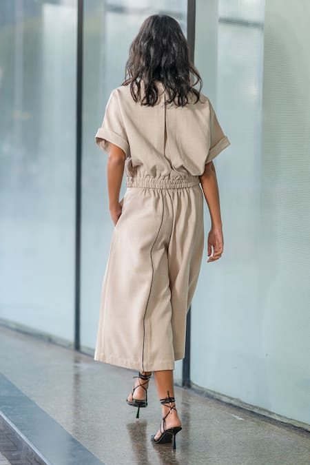 Beige A-line pant crafted from 100% rayon featuring piping details