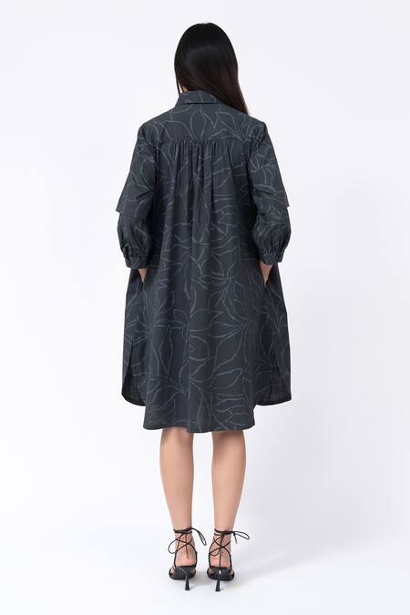 Black Cotton Collared Abstract Leaf Print Fence Shirt Dress