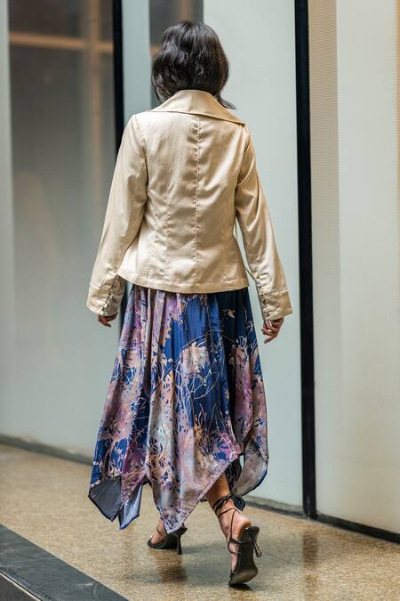 Ivory satin jacket featuring an asymmetrical front opening with tie-up and loops