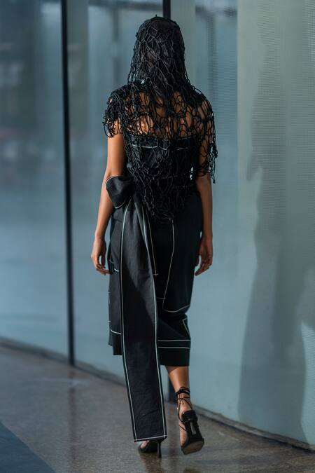 Black cotton canvas twill asymmetrical wrap dress featuring anchor thread stitch lines