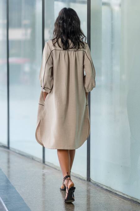 Contrast pipe detailing on the dress, Front concealed button placket, Rounded hem with side pockets