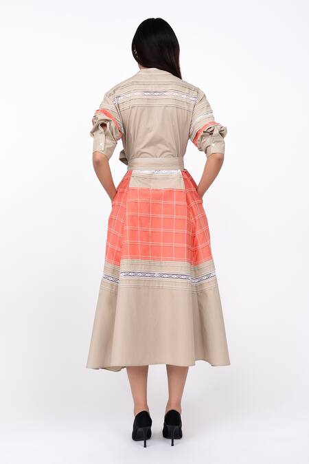 Beige and peach shirt dress featuring puffed sleeves and linear lace embellishments