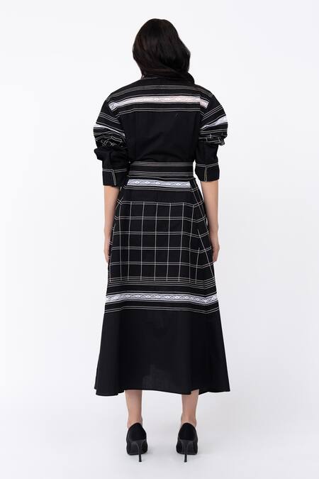 Black Cotton Lace Mandarin Channel Embellished Pintucked Hanker Shirt Dress