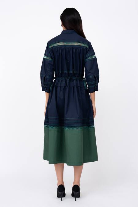 Blue Cotton Lace Collared Channel Embellished Pintucked Shirt Dress