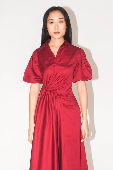 Red dress featuring a collared neckline and puff sleeves, crafted from 100% cotton. The dress includes gather detailing on the side, adding a unique touch to the relaxed fit.