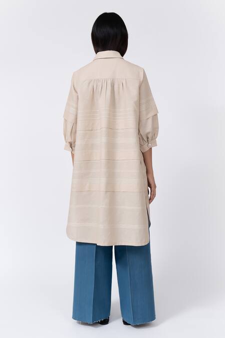 Beige linen shirt dress featuring white piping detailing and pleated sleeves
