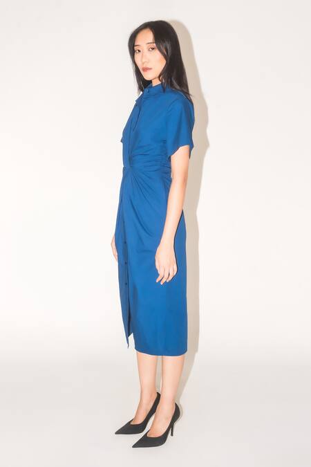 Blue Cotton Collared Iris Draped Asymmetric Midi Dress