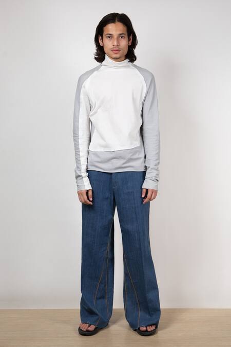 Blue Handloom Cotton Denim Thread Work Mould Panelled Jeans