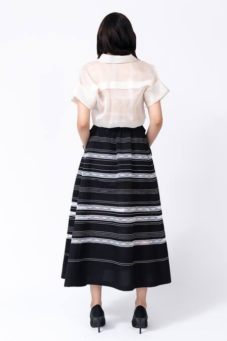 Black and off-white solid collared dress featuring pintucked detailing, an adjustable belt, and white piping