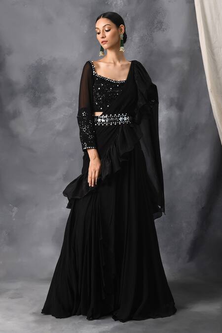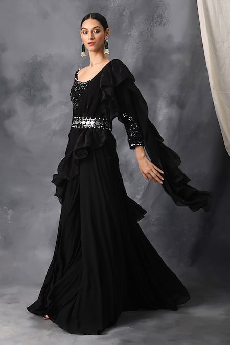 Black pre-draped lehenga saree with organza ruffle pallu. Comes with embroidered sweetheart neckline blouse and belt.