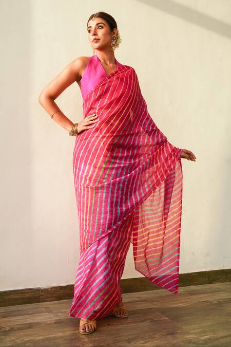 Fuchsia saree with multicolor leheriya pattern. Comes with running blouse fabric.