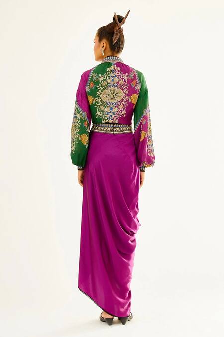 Purple draped skirt with printed, embroidered waistband.