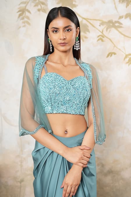 Buy_Libas Cafe by Nidhi & Ashish_Green Satin, Net Embroidery Open Neck, Hand Cape Blouse And Draped Skirt Set _at_Aza_Fashions