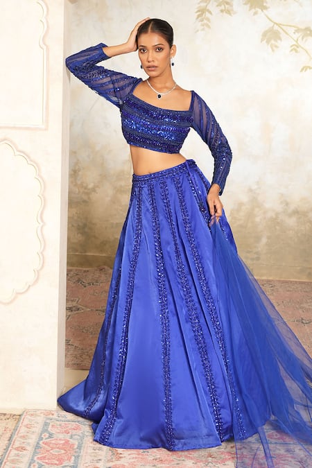 A blue organza lehenga featuring hand embroidered panel details and an attached can-can. It is paired with a padded, full-sleeved, hand embroidered beaded blouse and a matching organza dupatta.