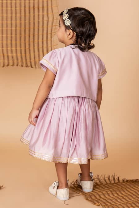 Lilac dress featuring half sleeves and cutdana bloom embroidery on the front. Paired with an attached tassel tie-up jacket for added style.