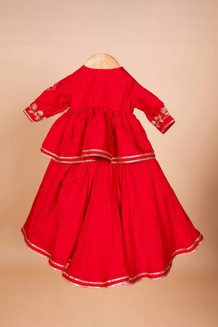 Red peplum blouse featuring floral, sequin, and gold thread embroidery. Paired with a lehenga adorned with stripe panels on the hem.