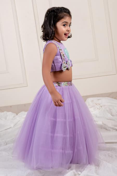 Lilac lehenga featuring an embroidered waistband with floral detailing. Paired with a sleeveless blouse adorned with heart tassel embellishments and sequin bows.