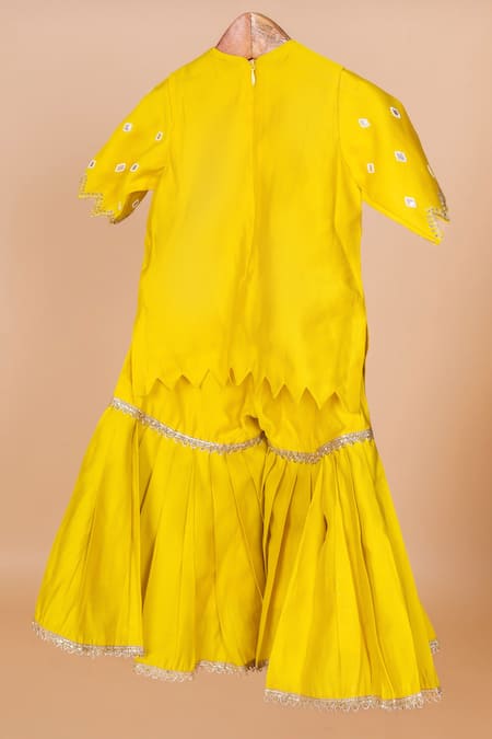Yellow silk tunic featuring pearl butti embroidery and paisley motifs. Paired with a matching sharara with cutwork hem and embellished edges.