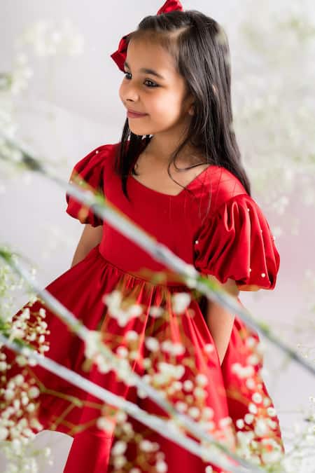 Red Cotton, Satin Pearls Embellished Sleeve Dress