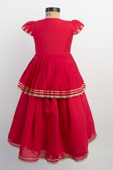 Intricate gold detailing on sleeves and hem, Layered peplum design for added volume