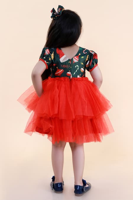 Red layered dress featuring a Christmas-themed printed bodice with puff sleeves
