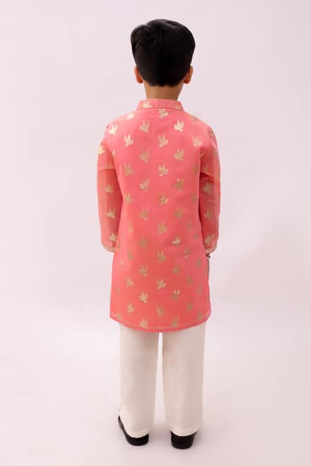 Peach kurta featuring floral patterns and a front button closure. Paired with matching peach poly silk pants with an elastic waistband.