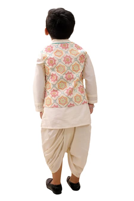 Off white kurta set featuring a Nehru jacket with a floral pattern. Includes a matching dhoti pant crafted from poly silk and mal cotton lining.