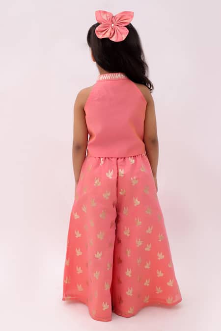 Peach Chanderi, Cotton Embroidery, Sequins Mishti Top And Floral Pattern Pant Set