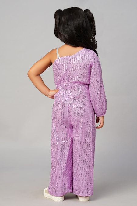 Lavender jumpsuit featuring one shoulder sleeves and sequin embellishments