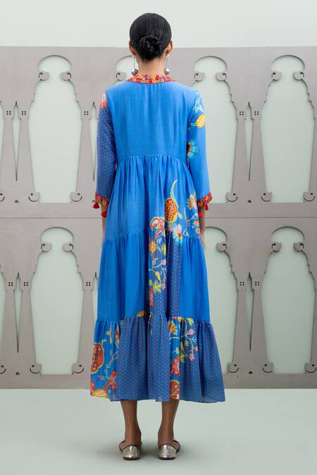 Blue tiered dress featuring floral patterns and placement sequin embroidery
