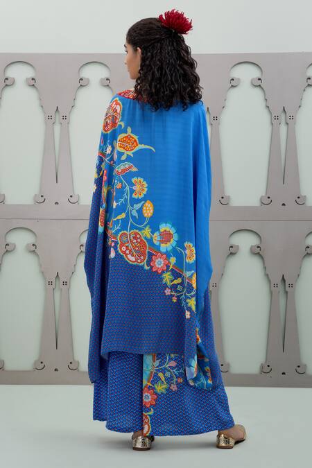 Blue flared kurta featuring floral embroidery with sequin work. Paired with matching pants for a complete look.