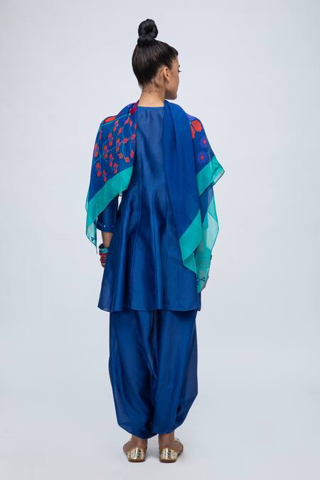 Blue kalidaar kurta featuring delicate mirror embroidery and a round neckline. Paired with a dhoti pant and a floral patterned scarf.
