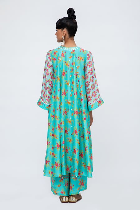 Turquoise anarkali featuring all-over floral print and mirrorwork details. Paired with matching pant and dupatta.