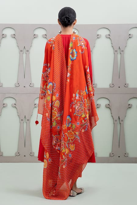 Red anarkali featuring a flared silhouette with floral sequin work. Paired with a floral pattern pant and coordinating dupatta.