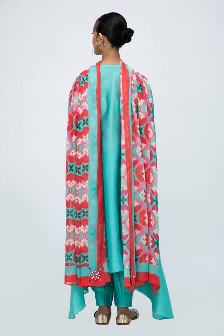 Turquoise asymmetric kurta featuring floral mirrorwork and a round neckline. Paired with gathered pant and floral print dupatta.